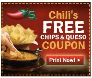 Chili's: Free Chips & Queso Coupon! - The PennyWiseMama Chili's: Free Chips & Queso Coupon! My family loves Chili's. We probably go there at least 2-3 times per month. One of our favorite appetizers to get is Chips & Salsa, so I am excited to see that you can get a FREE order of Chips & Queso just for signing up for Chili's email club.