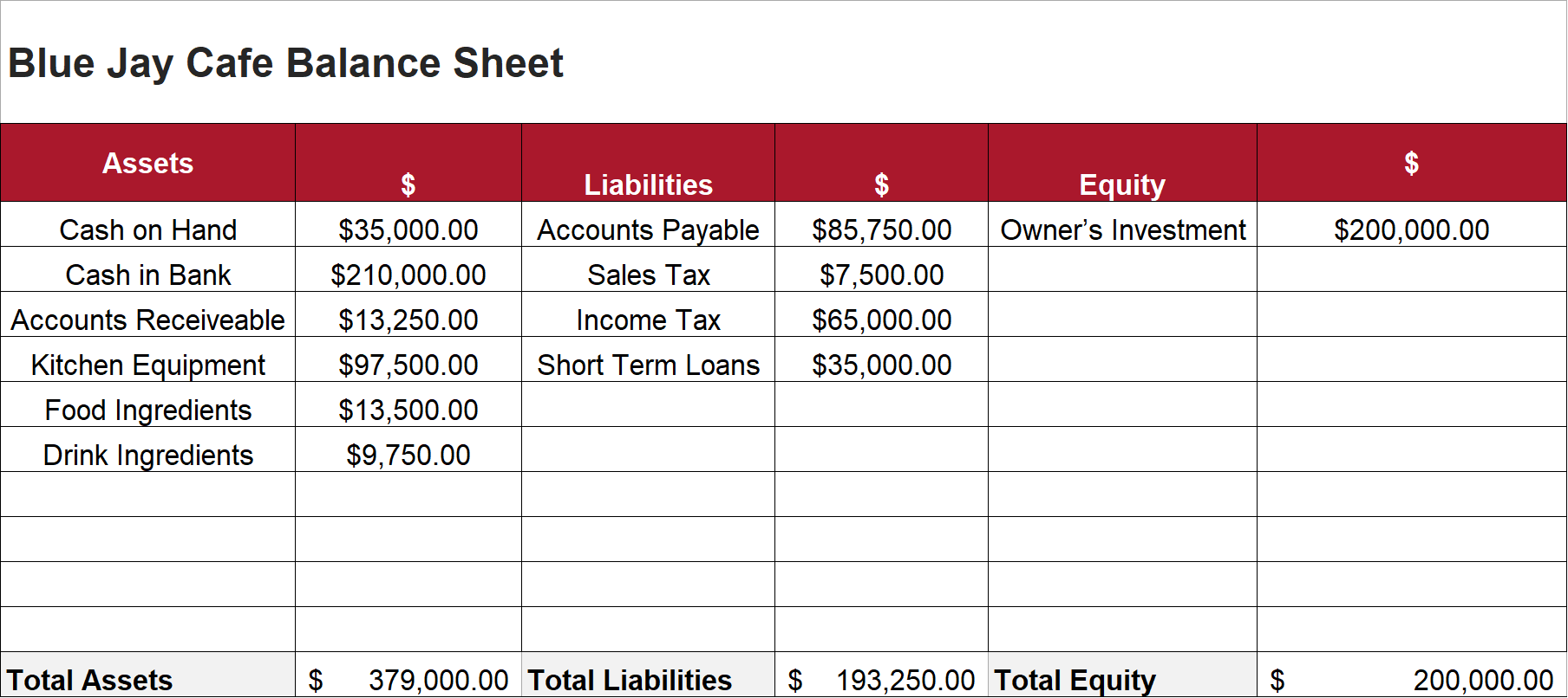 Blue Jay Cafe Balance Sheet Assets $ Equity Owner's | Chegg.com